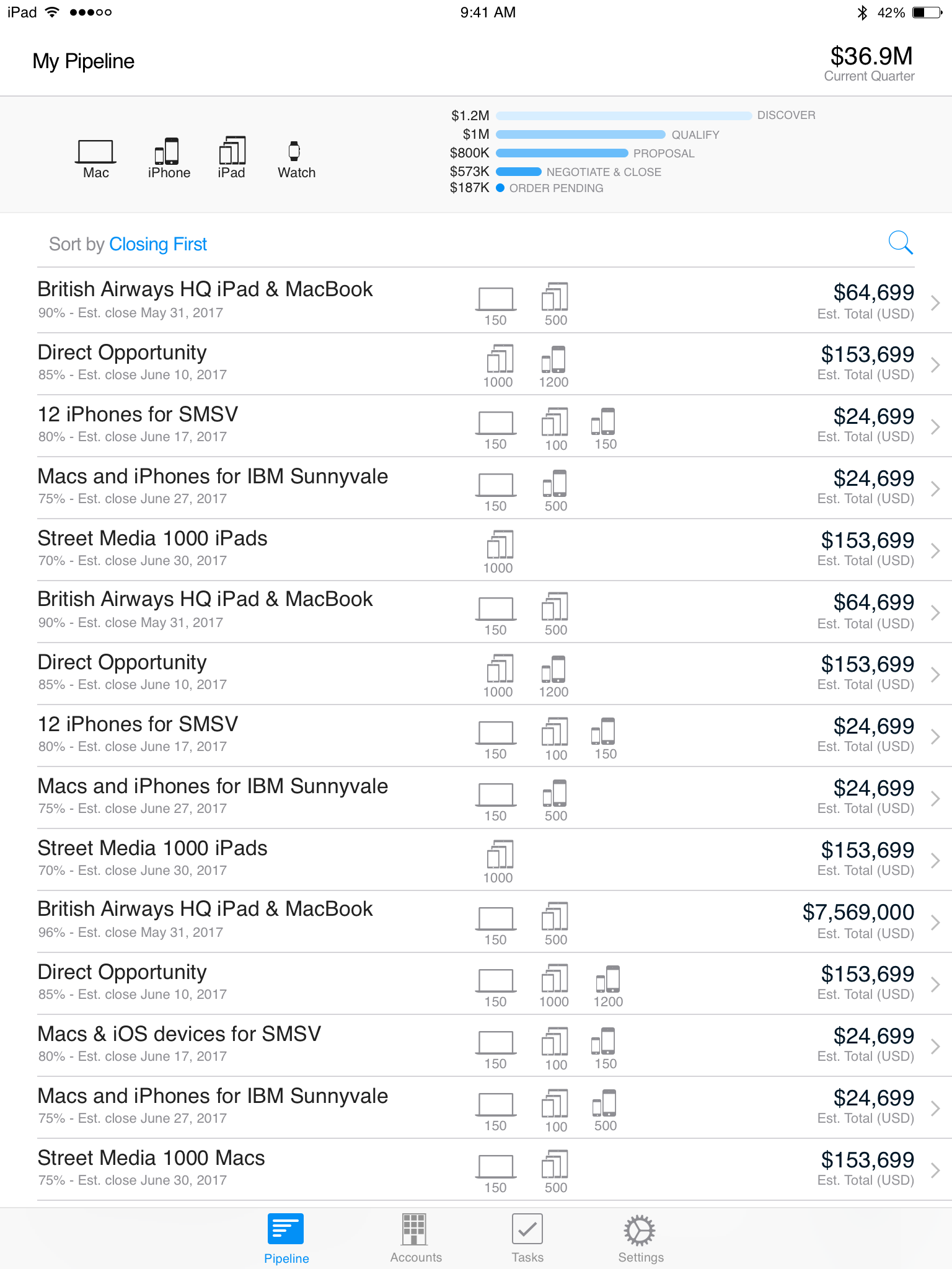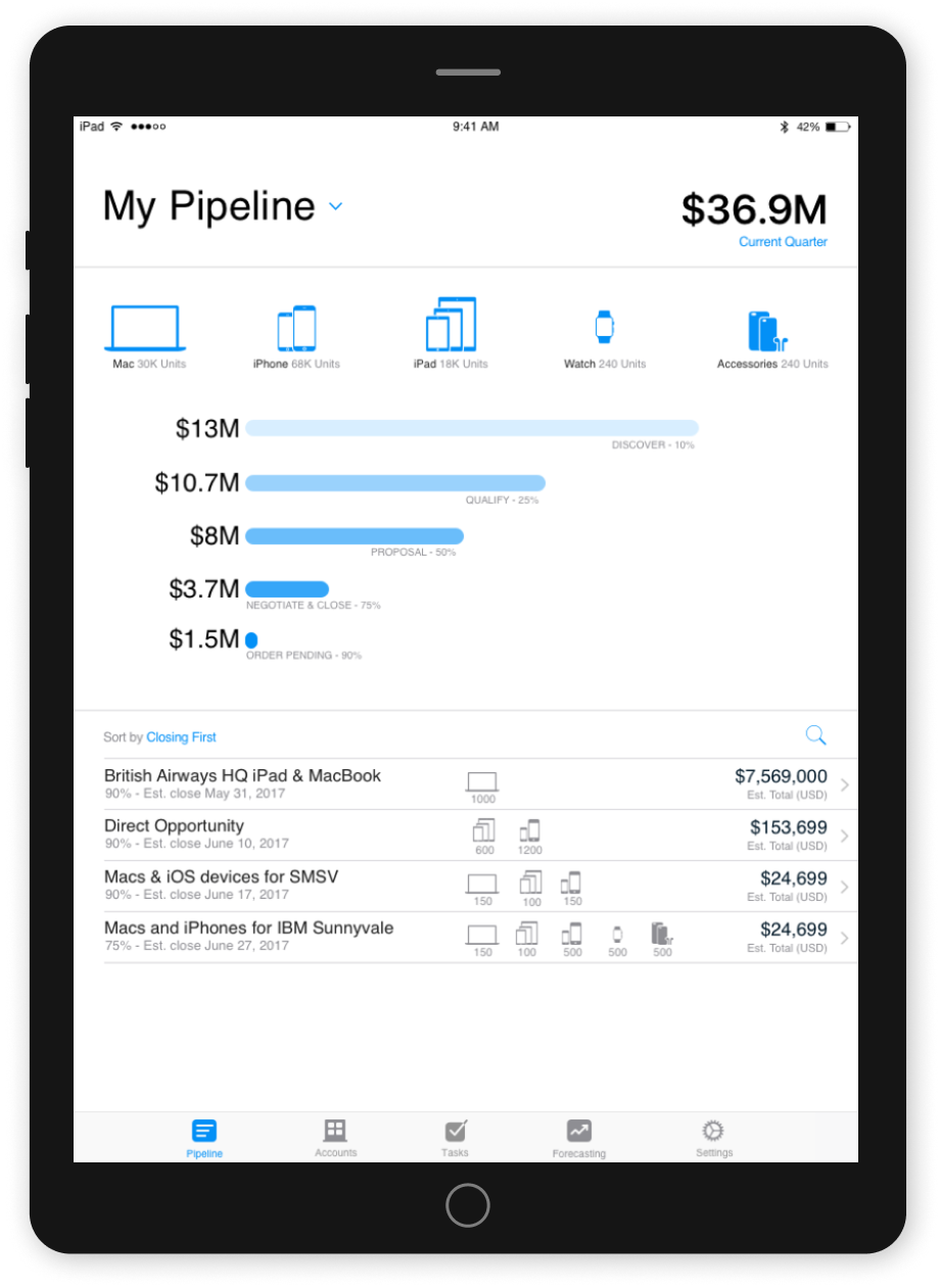 Apple’s B2B and Channel Sales group is responsible for about 70% of Apple’s total revenue worldwide. Apple’s sales teams needed an efficient, intuitive mobile solution to track their pipeline sales to third-party partners - major resellers (Target, BestBuy), mom-and-pop shops throughout Asia and Europe, B2B partners (British Airways), and the Education sector (universities, schools).