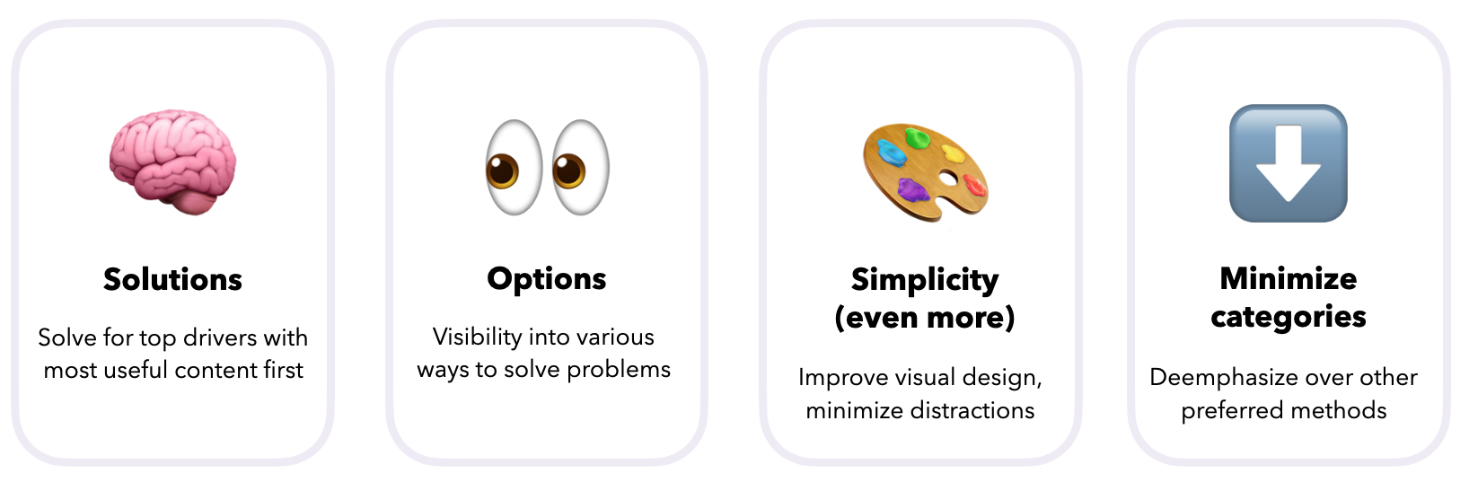 Starting by defining the needs and problems of both the business and the users, and through extensive and thoughtful user research, we developed a phased approach - homepage, search results, contacting support, and personalization with machine learning - providing the flexibility to drive the designs forward and also be agile in our progress as business and user needs change.