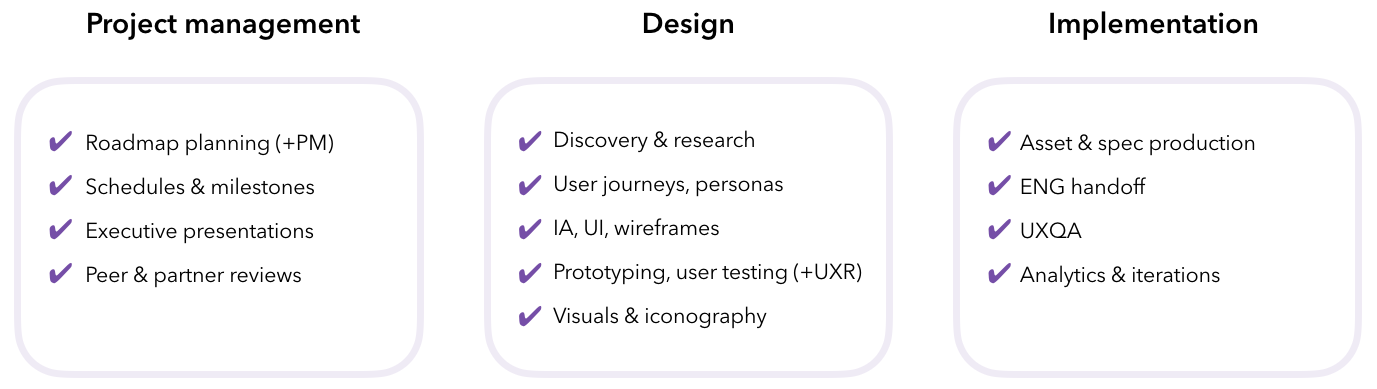 • Presenting UX leadership design reviews, and share-outs with non-designer partners (C- & VP-level executives, stakeholders, engineers, etc)