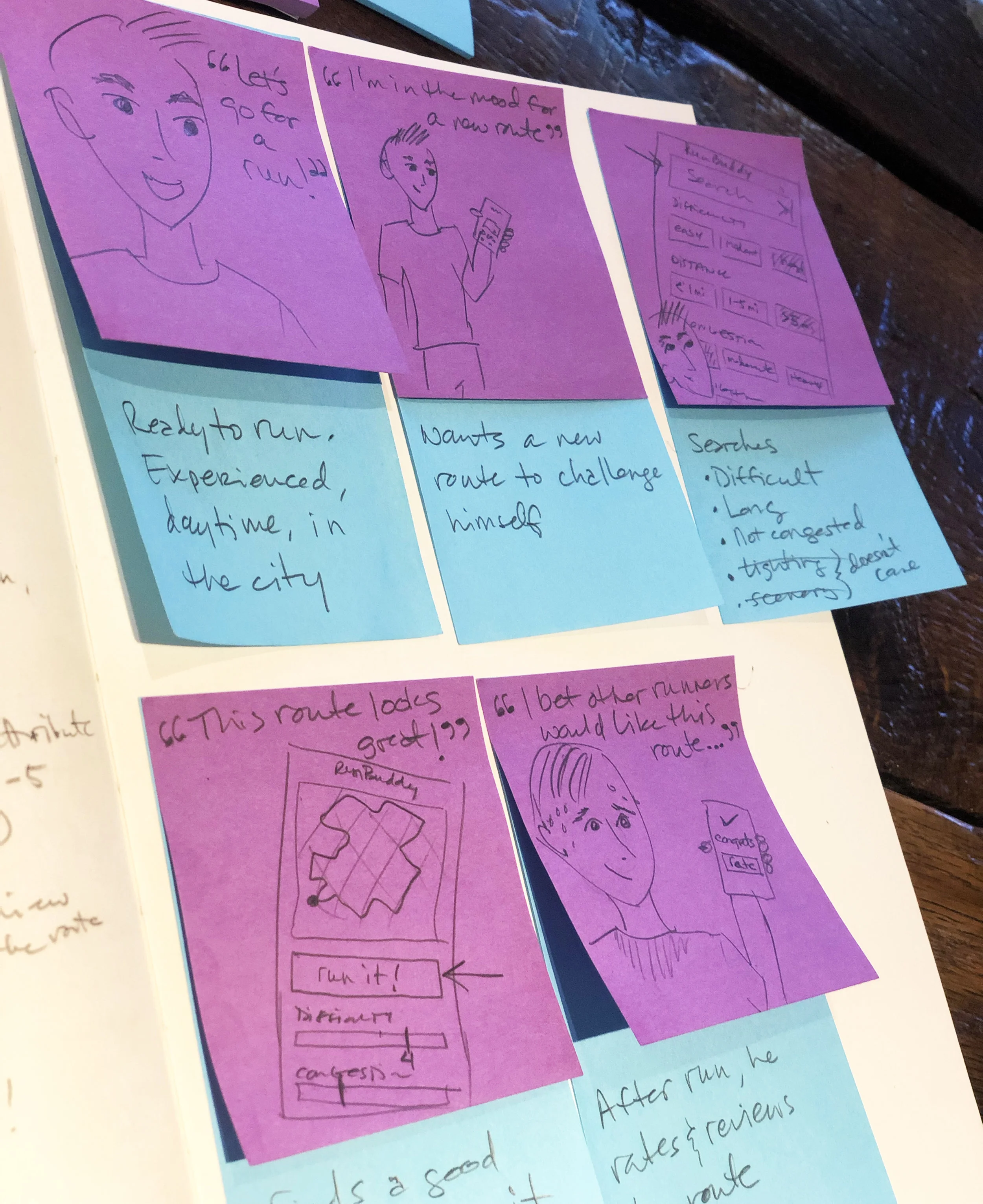 Next, I started generating ideas for the features and layout of the main flow, which shows a user searching for a new run route based on specific attributes, selecting a route, and reviewing the route after he finishes his run.